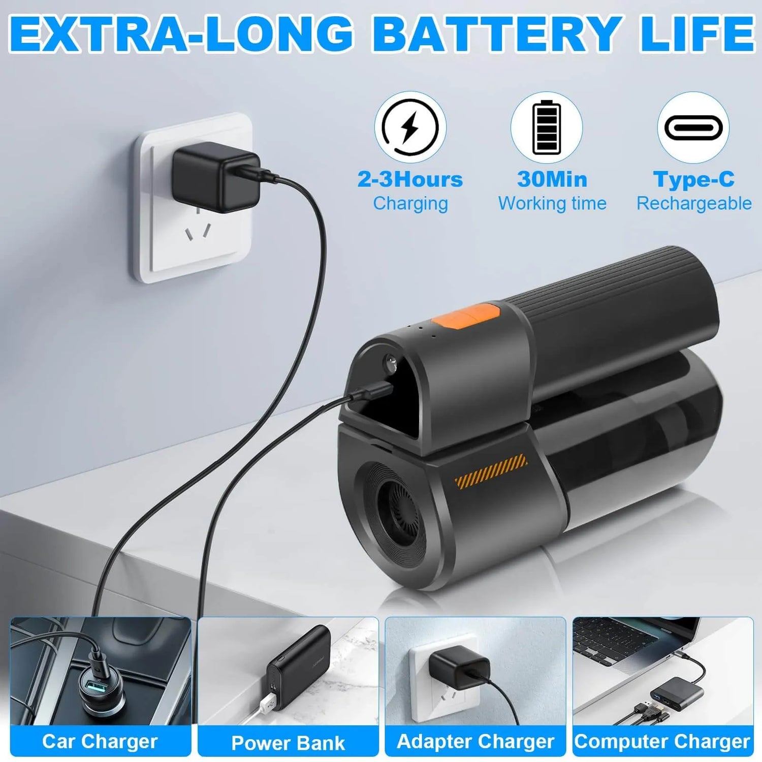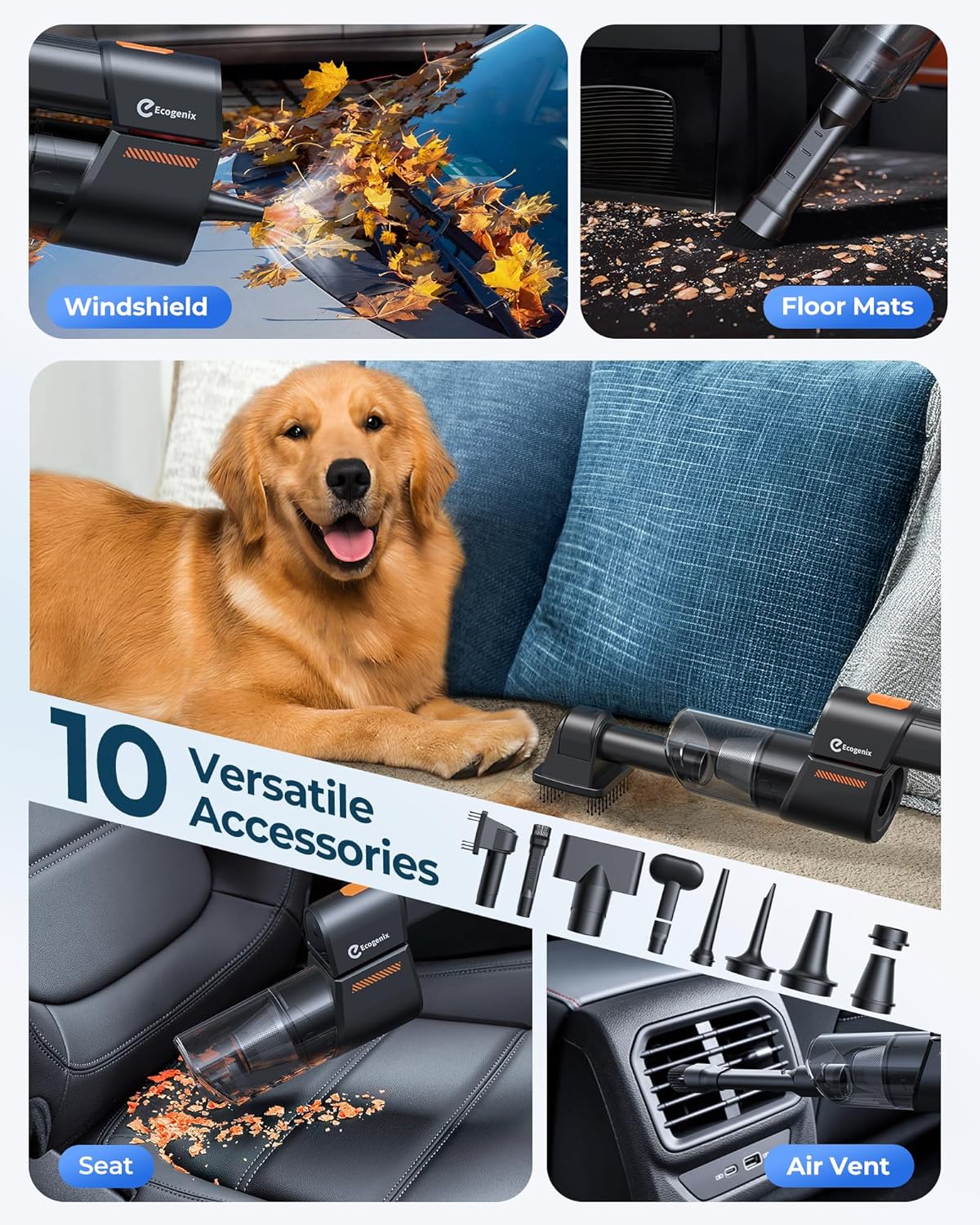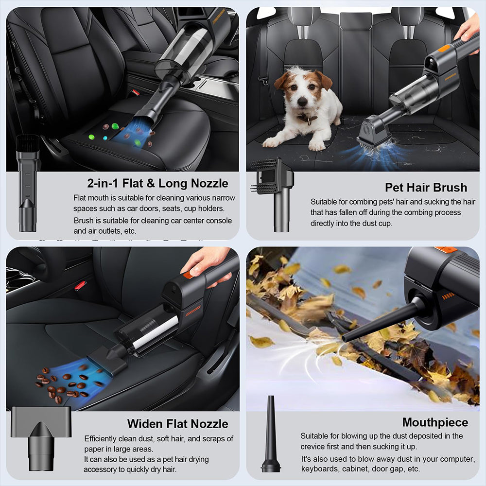It’s effective on dust, sand, food crumbs, pet hair, and small debris from fabric seats, leather, carpets, hard surfaces inside your vehicle and electronic components specially PC.