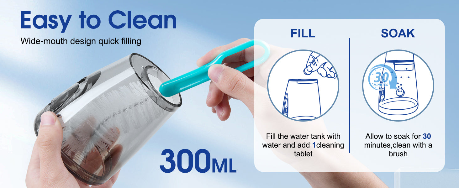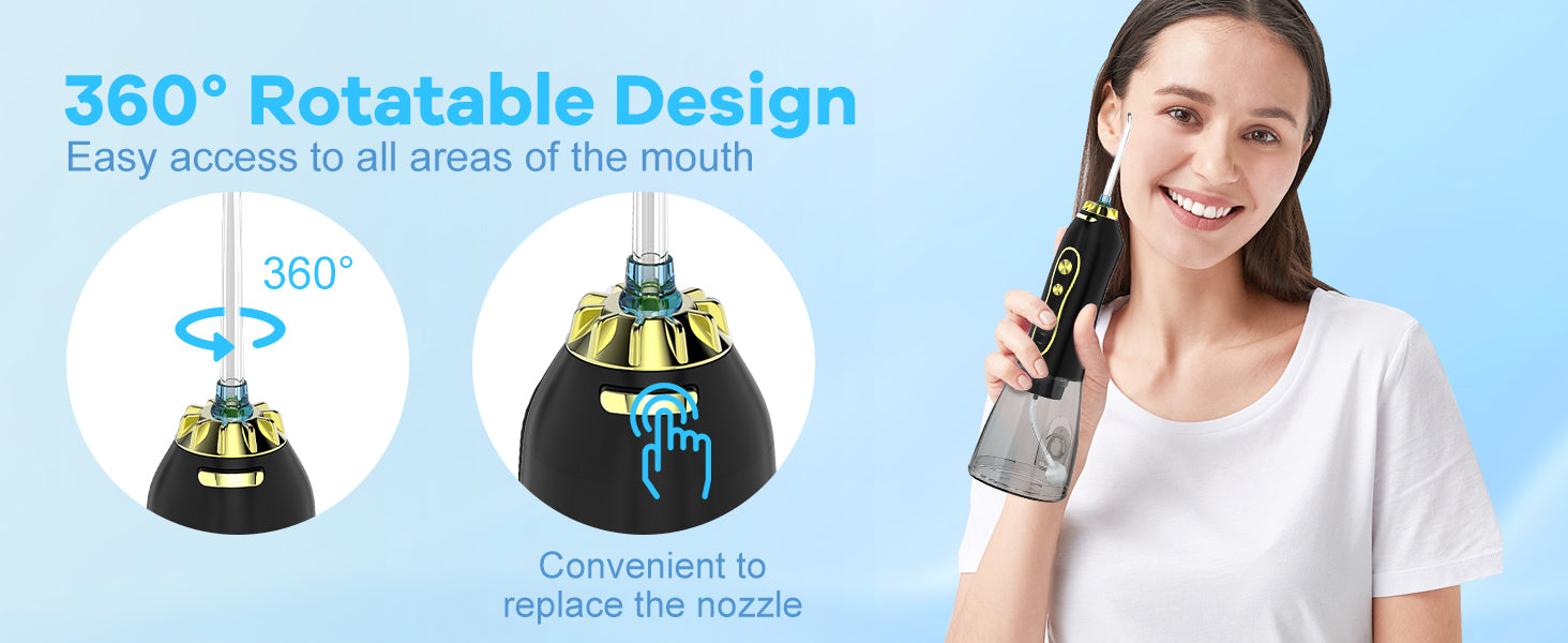 360-degree rotating nozzle, allowing you to effortlessly reach every corner of your mouth — including hard-to-access areas between teeth and along the gumline.
